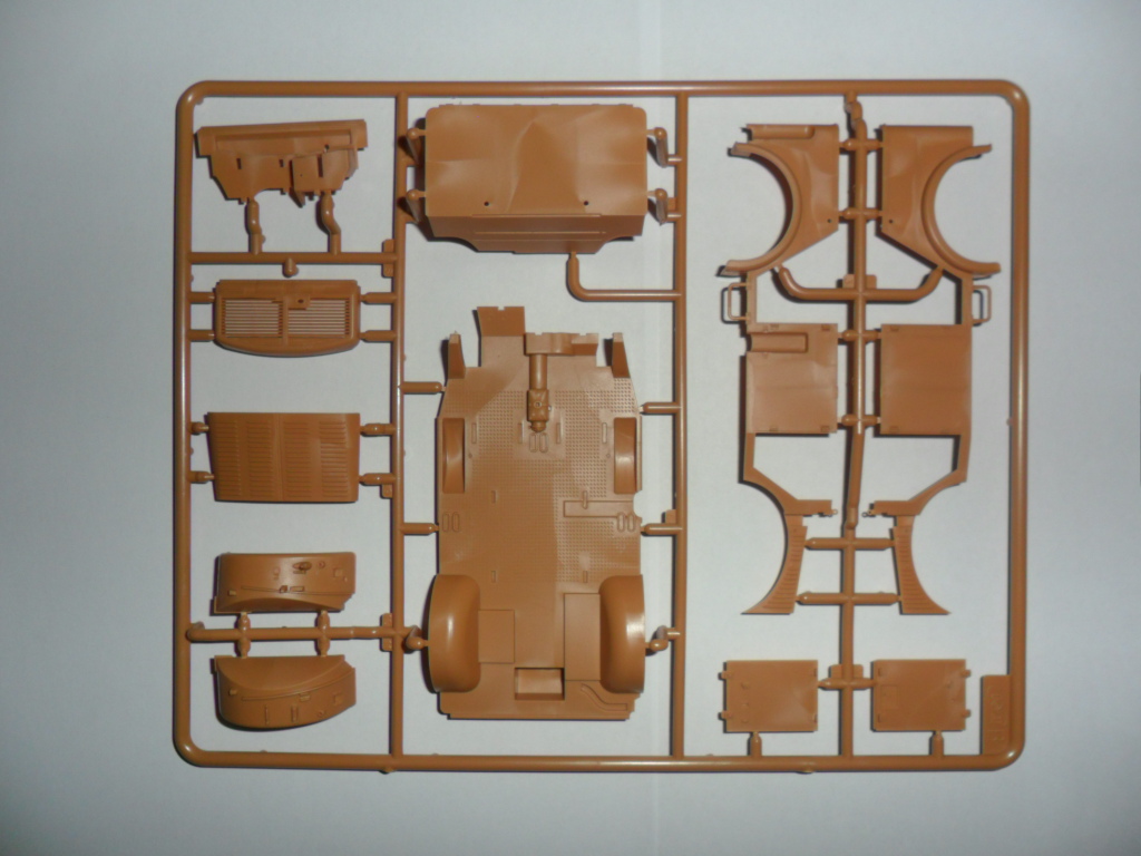 Детализированный сборный кузов, проработанный интерьер с сиденьями, панелью приборов, элементами управления, двери выполнены отдельными деталями, имитация брезентового покрытия.