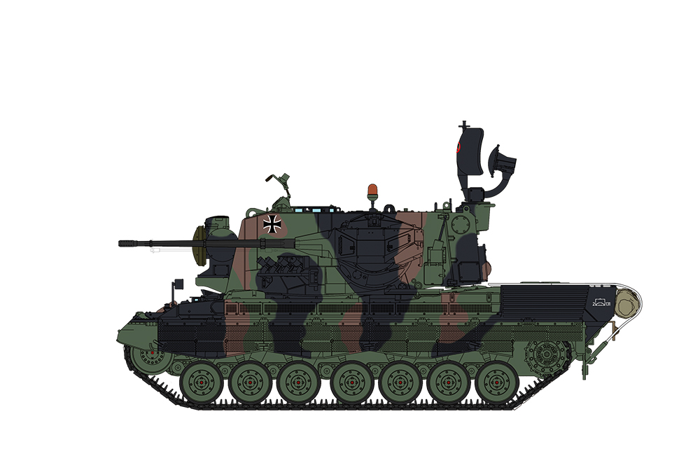 Flakpanzer Gepard, поступивший на военную службу в 1973 году, представляет собой самоходную зенитную пушку, разработанную для крупномасштабной механизированной войны Западной Германией. Она оснащена двумя 35-мм автопушками Oerlikon KDA, которые могут стрелять непрерывно или в режиме серийной стрельбы. Эта машина имеет длину 7,76 м, ширину 3,28 м и боевую массу 47,5 т. При развернутой поисковой РЛС ее высота составляет 4,22 м.
