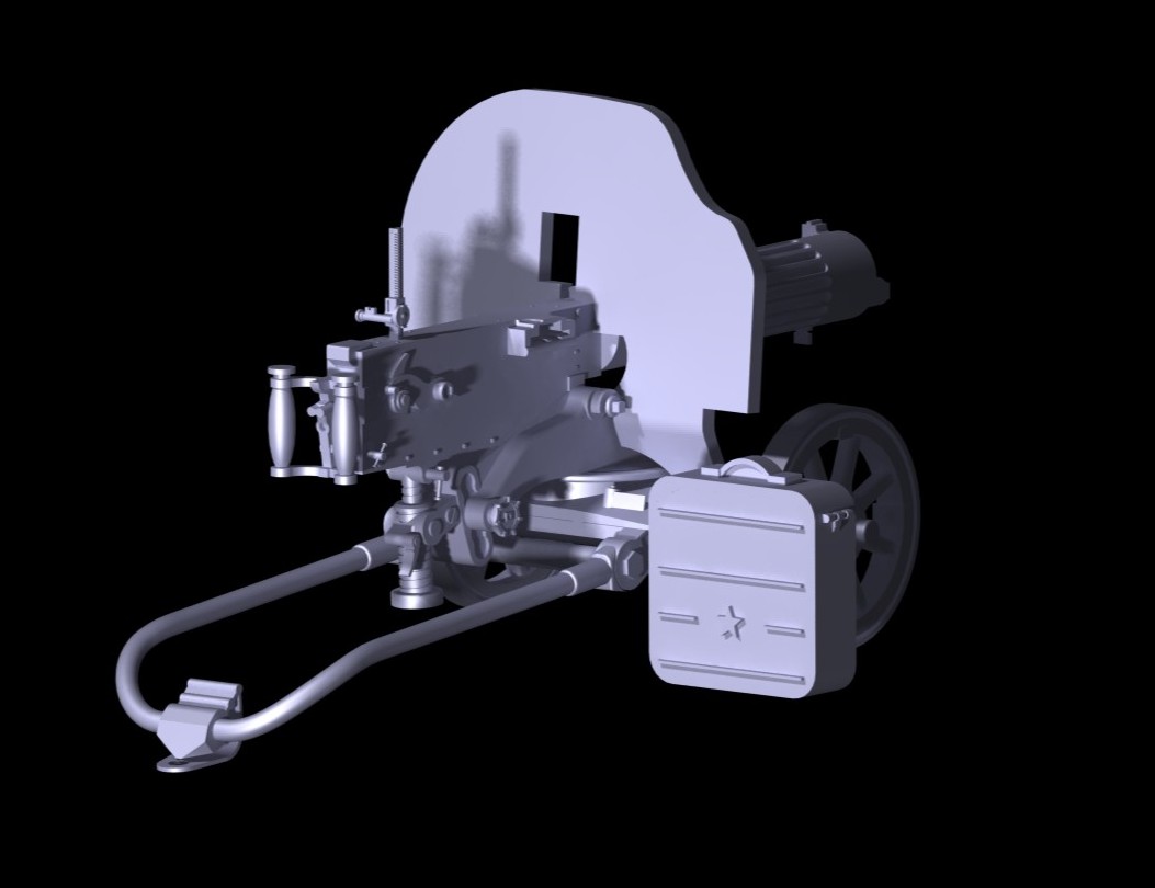 Детализированный сборный колёсный станок, проработанная казённая часть, кожух ствола с продольным рифлением, прицел, короб с лентой патронов.
