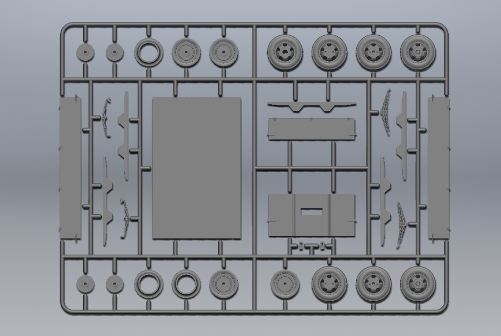 Детализированный гусеничный привод, пластиковая наборная гусеничная лента с прямыми участками, выполненными единой деталью, сборная несущая рама, выхлопная система выполнена отдельной деталью.