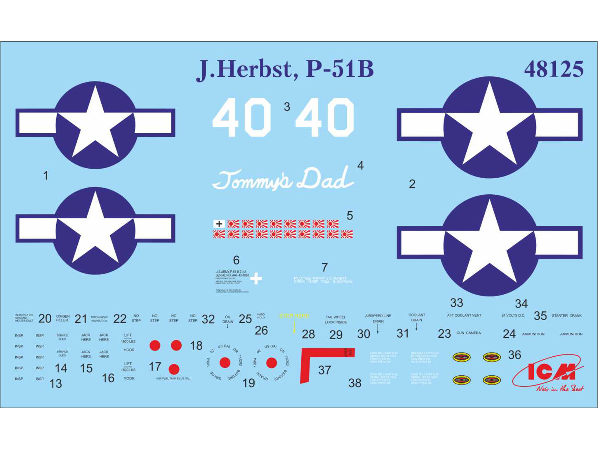 Набор включает модель P-51B майора Дж. Хербста, аса 23-й истребительной группы, а также пять фигур пилотов и техников ВВС США времен Второй Мировой войны