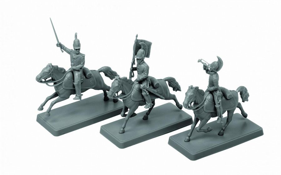Набор деталей из пластмассы для сборки 3-х неокрашенных конных фигур.