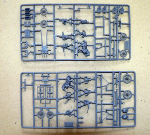Набор деталей из пластмассы для сборки 3 пушек, 10 пеших фигур и 2 лошадей.