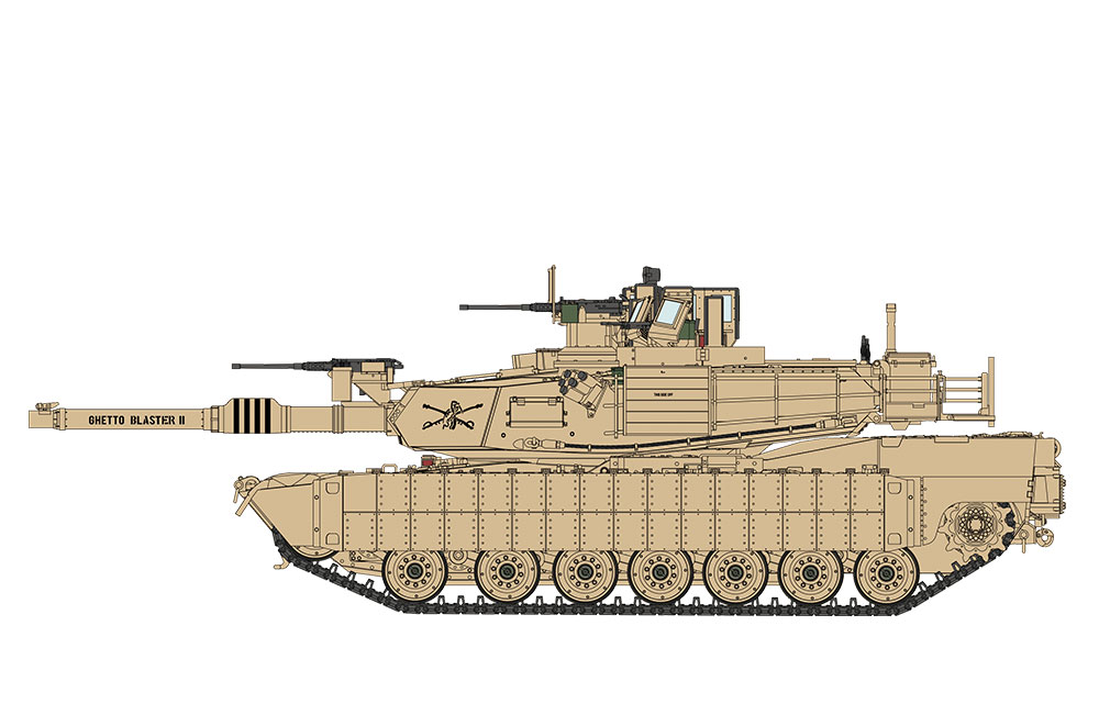 M1A2 SEP - это новейший вариант американских основных боевых танков серии M1. M1A2 SEP, служащие на Ближнем Востоке и в Афганистане, обычно оснащаются комплектом выживания Tank Urban Survival Kit (TUSK). «Rомплект дополнительного оборудования и бронирования, повышающий боевые возможности в городских условиях», предназначенный для монтажа на танки М1А2, включает в себя комплекс динамической защиты ARAT для повышения защиты боковых проекций от кумулятивных средств поражения, тепловизионный прицел для пулемёта М240, щитки для защиты командира и заряжающего при наблюдении из открытых люков, разнесённое бронирование днища, гарнитуру для связи с пехотой, дополнительный пулемёт М2 на установке CSAMM (монтируется на маске орудия), дистанционно-управляемую установку CROWS.