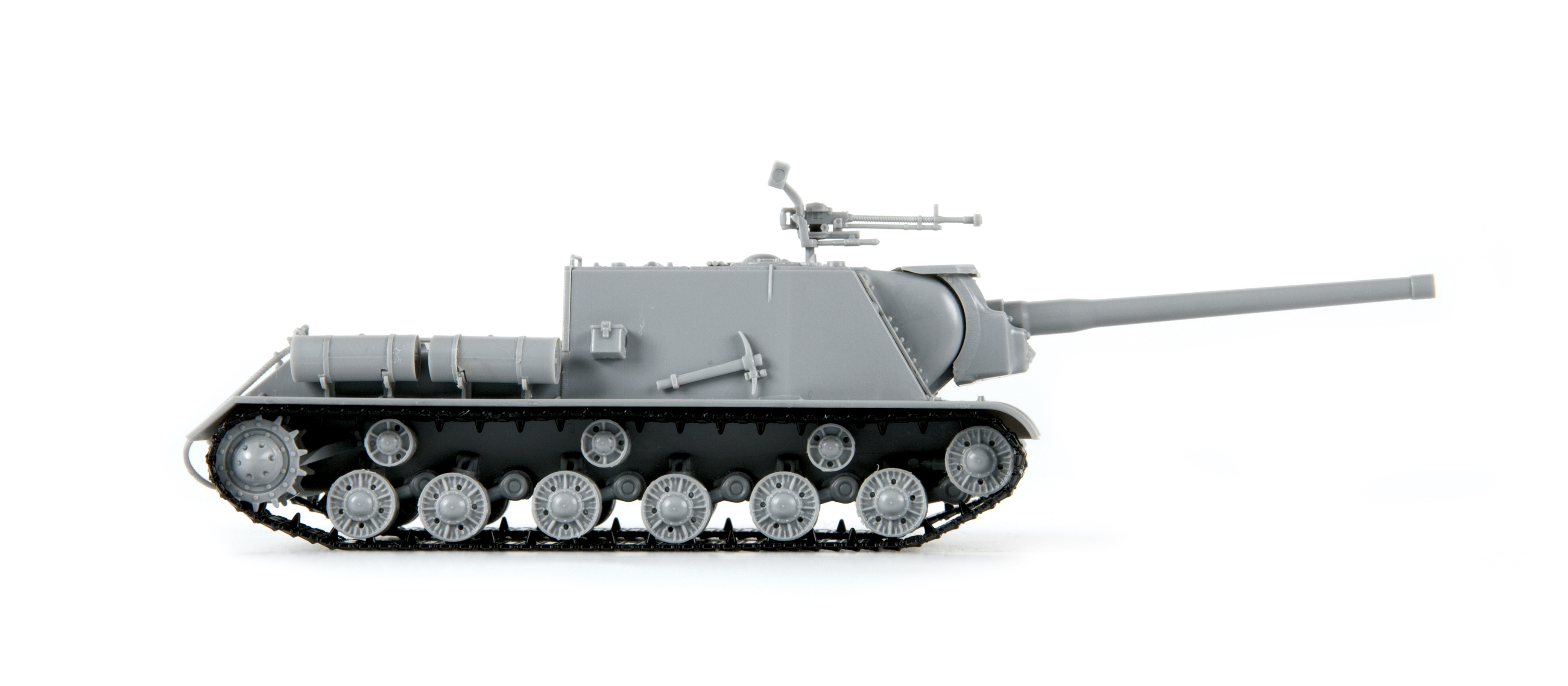 Историческая справка: Самоходная артиллерийская установка ИСУ-122 создана осенью 1943 года на базе тяжёлого танка ИС. На этих машинах устанавливались пушки А-19 калибром 122 мм с начальной скоростью 25-кг снаряда 781 м/с, который пробивал с расстояния 1 км 145-мм броню. Общая компоновка тяжёлой самоходной артиллерийской установки ИСУ-122 аналогична компоновке других САУ: носовое расположение отделения управления и боевого отделения и кормовое расположение моторно-трансмиссионного отделения. Кроме пушки на САУ стоял 12,7 мм зенитный пулемёт ДШК.